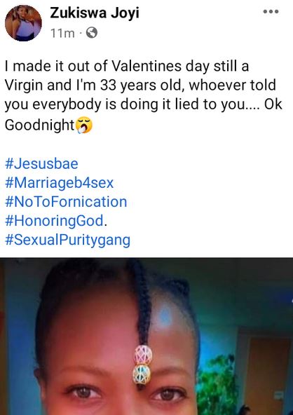 ”I made it out of Valentines day still a Virgin and I’m 33 years old, whoever told you everybody is doing it lied to you…. Ok Goodnight”.the gospel artist wrote on Thursday night.