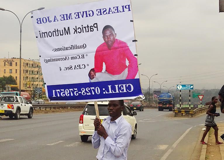 Photos of Patrick Muthomi, an unemployed graduate from Chuka University, carrying a placard in the streets of Nairobi; with his educational qualifications and phone contact listed on it, have been making the rounds on social media since Wednesday.