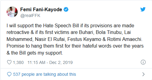 Taking to his verified Twitter handle @realFFK on Monday afternoon, Fani-Kayode said he would support the Hate Speech Bill if its provisions are made retroactive and if its first victims are President Muhammadu Buhari, APC National Leader Bola Tinubu, Information Minister Lai Mohammed, and others he also mentioned.