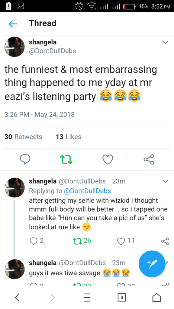 @DontDullDebs :The funniest & most embarrassing thing happened to me yday at mr eazi’s listening party .after getting my selfie with wizkid I thought mmm full body will be better… so I tapped one babe like “Hun can you take a pic of us” she’s looked at me like , Who’s this??.