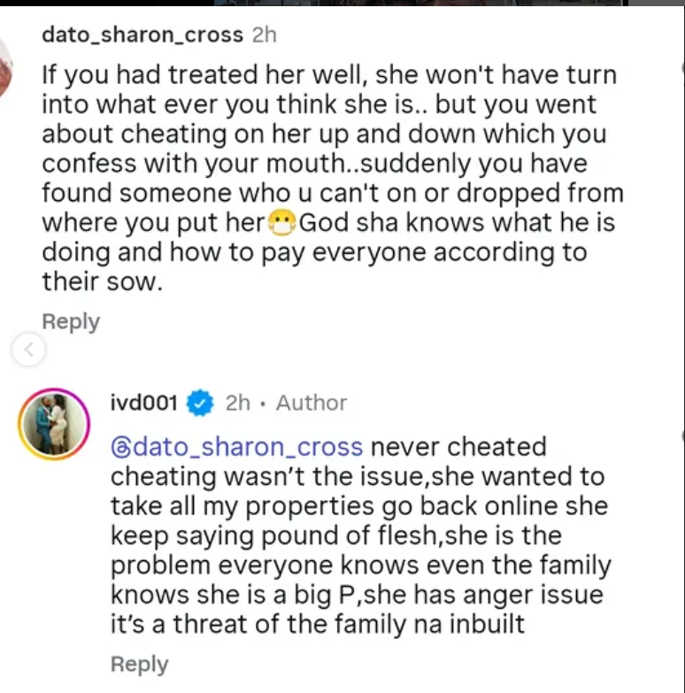 In the comment section, one user claimed he cheated on his wife “up and down,” and that he was now claiming loyalty to a new partner. Responding, IVD wrote: