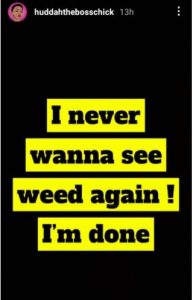 The Big Brother Africa star stated this today. “I never wanna see weed again! I ‘m done.” she wrote.