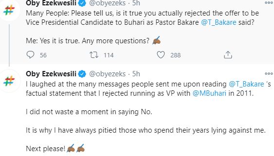 I laughed at the many messages people sent me upon reading Tunde Bakare’s factual statement that I rejected running as VP with President Buhari in 2011. I did not waste a moment in saying No. It is why I have always pitied those who spend their years lying against me. Next please!”she tweeted.