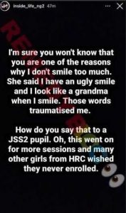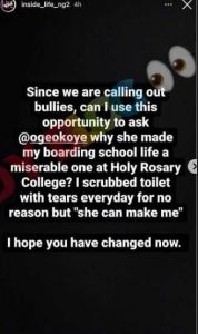 Taking to her Instagram story, the social media user identified as inside_life_ng2 accused the actress of both physical and emotional bully.