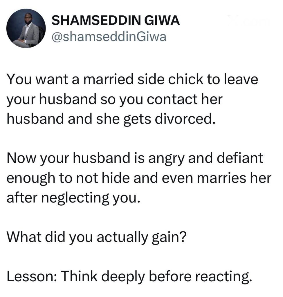 She disclosed this after another woman shared her experience with her husband’s married side chick.