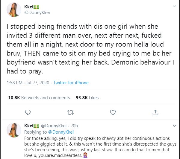 “I stopped being friends with dis one girl when she invited 3 different man over, next after next, fucked them all in a night, next door to my room hella loud bruv, THEN came to sit on my bed crying to me bc her boyfriend wasn’t texting her back. Demonic behaviour I had to pray.