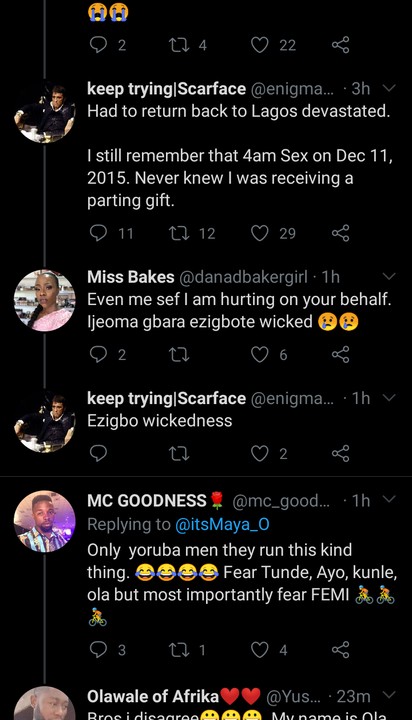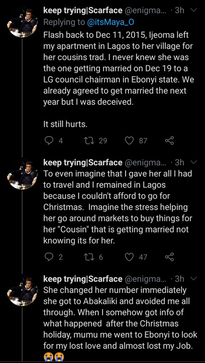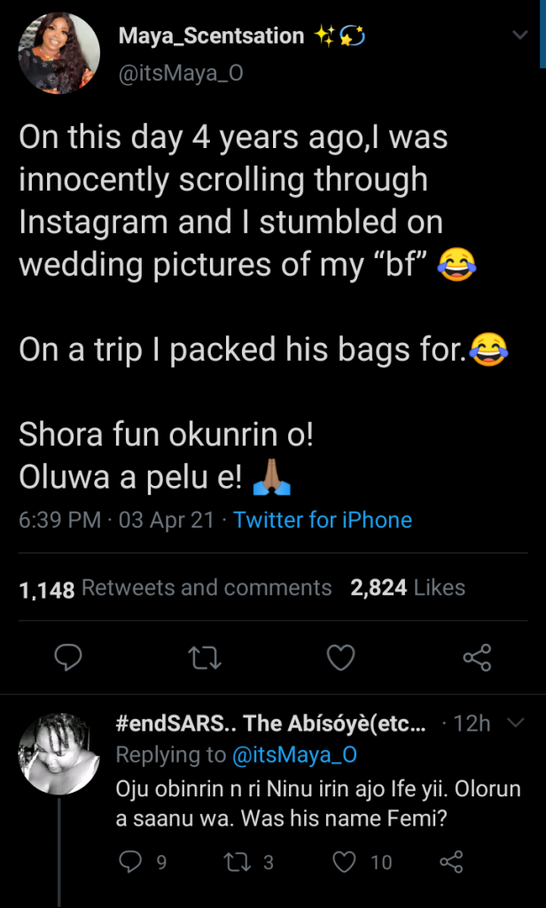 A Twitter lady by name @itsMaya_O this morning recounts her ordeal of 4 years ago with a Nigerian man who supposedly was her boyfriend. She helped him pack his bag for a trip she didn’t know was his traditional marriage with another woman.