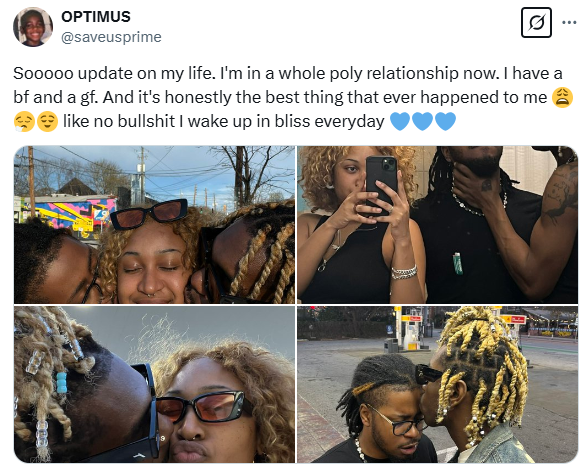 An American man who goes by the X handle, Optimus, has revealed that he is in a polyamory relationship and has a girlfriend as well as a boyfriend.