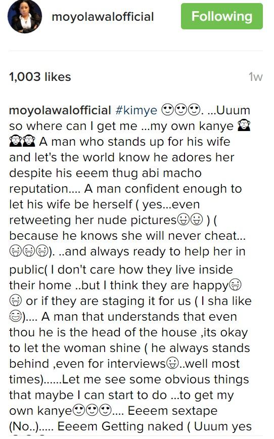“#kimye . …Uuum so where can I get me …my own kanye A man who stands up for his wife and let’s the world know he adores her despite his eeem thug abi macho reputation…. A man confident enough to let his wife be herself ( yes…even retweeting her Nood pictures ) ( because he knows she will never cheat…). ..and always ready to help her in public( I don’t care how they live inside their home ..but I think they are happy or if they are staging it for us ( I sha like )…. A man that understands that even thou he is the head of the house ,its okay to let the woman shine ( he always stands behind ,even for interviews..well most times)……Let me see some obvious things that maybe I can start to do …to get my own kanye…. Eeeem $€xtape (No..)….. Eeeem Getting n*ked ( Uuum yes )….. Eeeem surgery ( No…am an Oliver twist before I end up looking like a blowup doll) ….. Eeeem constant red carpet appearances( bank work but I can try) … Eeeem makeup always on fleek (hard oooh but I can try ,it should sha not age me ) …. Eeeem always dressed up( haaaa bank work…I like my hobo look … Eeeeem two failed marriages ( haaa ) …………… Men …. My own Kanye,u know this is not Hollywood ,so eeem things don’t have to get too extreme before you find me .. yeah”