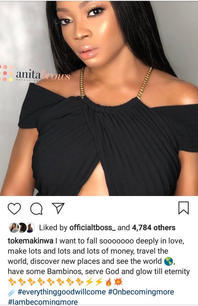 Toke Makinwa has listed some of the things she wants and love is number one on the list – not to forget babies too.