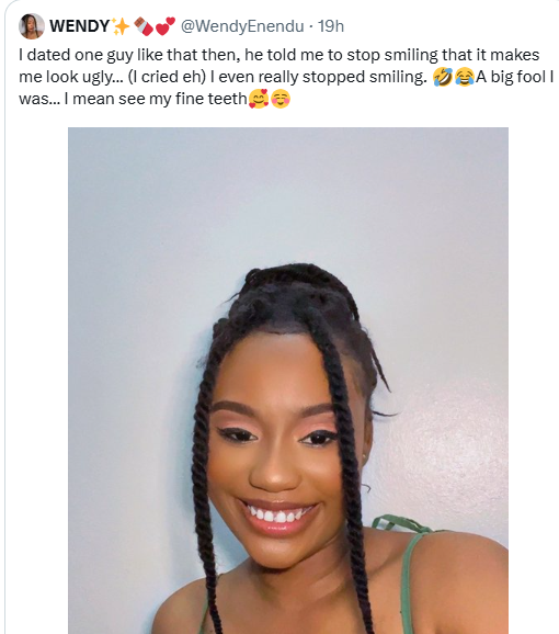 “I dated one guy like that then, he told me to stop smiling that it makes me look ugly… (I cried eh) I even really stopped smiling. A big fool I was… I mean see my fine teeth,” she wrote on Monday.