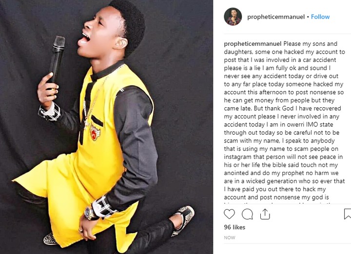 A young Nigerian pastor who was busted for faking accident, in a new Instagram post disclosed that he was hacked.