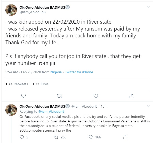 @iam_AbiodunB revealed that he was released on February 22, after his family and friends paid a ransom.