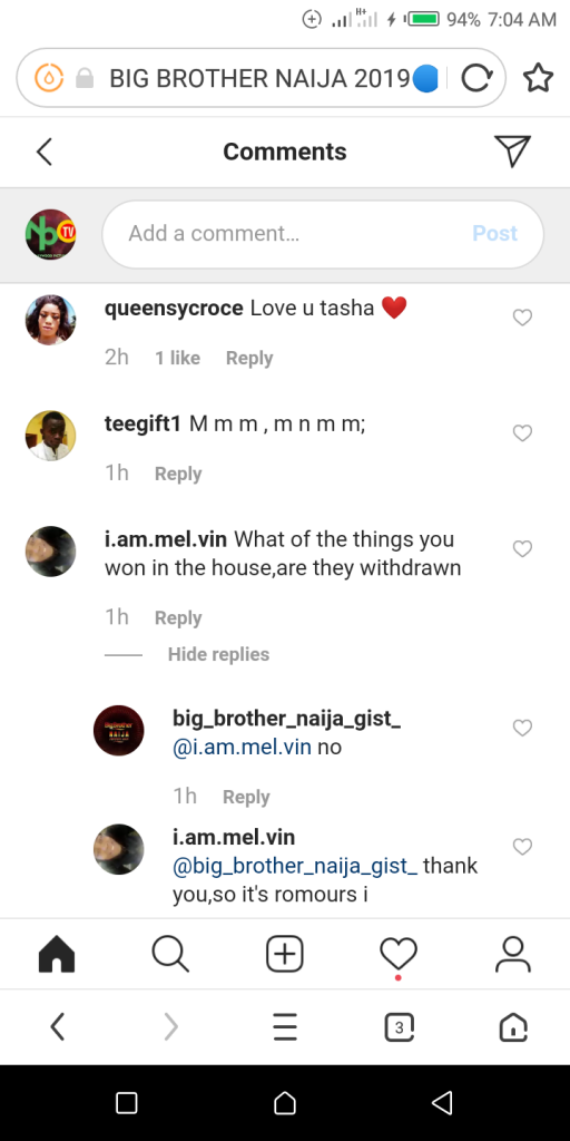 Recently Disqualified Bbnaija Tacha, In a live video she did recently after addressing her fans reacted to the rumours of been kept hostage by bigbronaija Organizers. Says she was never held hostage as spread by rumour mongers, says she decided to stay off for a few days by herself.