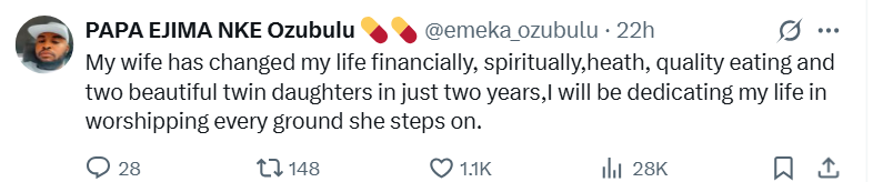 A Nigerian man, Emeka, has penned a heartfelt note of appreciation, deep gratitude and love for his wife, vowing to spend the rest of his life worshipping the ground she walks on.