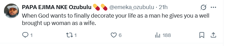“When God wants to finally decorate your life as a man he gives you a well brought up woman as a wife.”