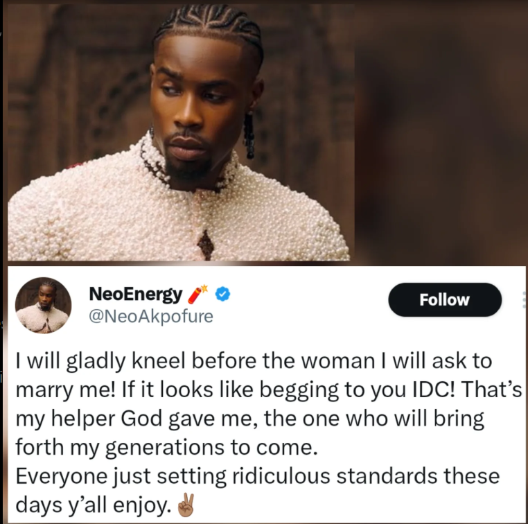 Reality TV star Neo Akpofure has weighed in on the trending argument about whether men should kneel when proposing.