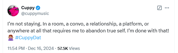 “I’m not staying. In a room, a convo, a relationship, a platform, or anywhere at all that requires me to abandon my true self. I’m done with that!”