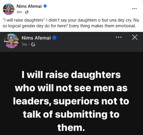 A Nigerian woman, Nims Afemai, has said she will raise daughters who will neither submit to men nor see them as the superior gender.
