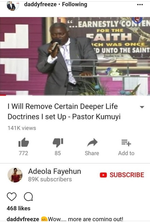 The controversial OAP shared a post on Instagram showing Pastor Kumuyi’s tweet which is bound to have thrown the Deeper Life Ministry into chaos.