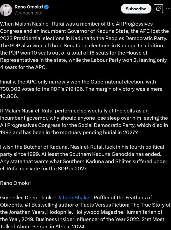 I wish the Butcher of Kaduna, Nasir el-Rufai, luck in his fourth political party since 1999. At least the Southern Kaduna Genocide has ended. Any state that wants what Southern Kaduna and Shiites suffered under el-Rufai can vote for the SDP in 2027.
