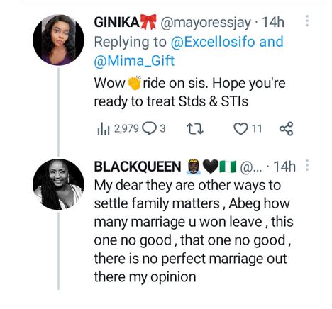 “My dear, there are other ways to settle family matters. Abeg, how many marriage u won leave, this one no good , that one no good , there is no perfect marriage out there my opinion,”
