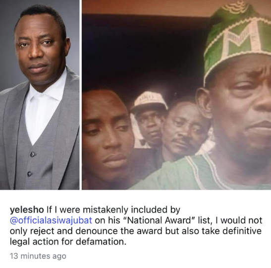 Reacting to this development, Sowore in a post shared on social media this afternoon, said if he was included in the list, he would have rejected the award and instituted a legal action against President Tinubu for defamation.