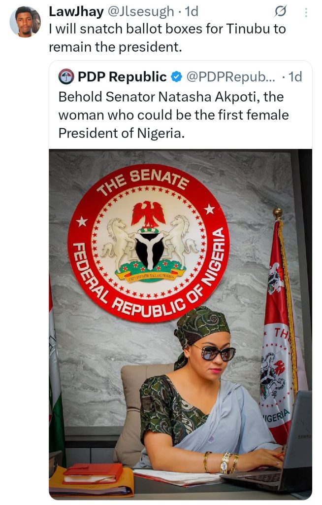 PDP Republic, a verified Twitter account dedicated to promoting the People’s Democratic Party, shared a photo of Senator Natasha Akpoti and wrote: “Behold Senator Natasha Akpoti, the woman who could be the first female President of Nigeria.”