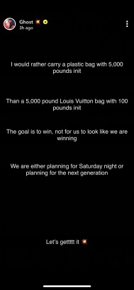 “I would rather carry a plastic bag with £5000 pounds innit than £5000 pound Louis Vultton bag with £ 100 pounds innit.