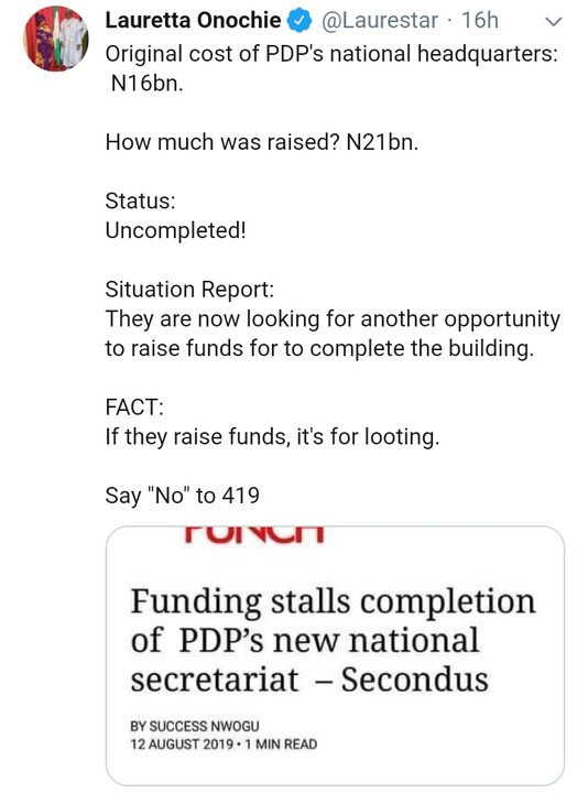 Lauretta made this statement while commenting on the issue of funding PDP is facing to complete its new national secretariate.