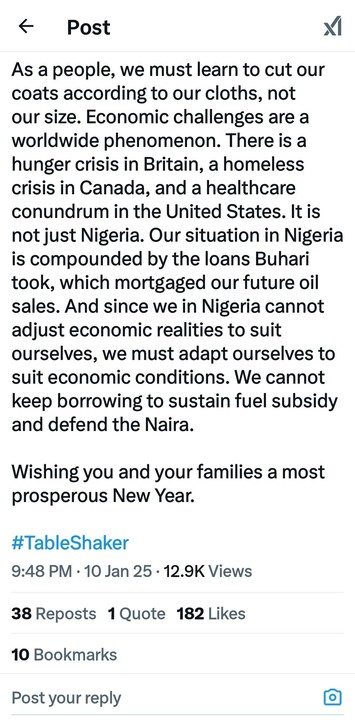 As a people, we must learn to cut our coats according to our cloths, not our size. Economic challenges are a worldwide phenomenon. There is a hunger crisis in Britain, a homeless crisis in Canada, and a healthcare conundrum in the United States. It is not just Nigeria. Our situation in Nigeria is compounded by the loans Buhari took, which mortgaged our future oil sales. And since we in Nigeria cannot adjust economic realities to suit ourselves, we must adapt ourselves to suit economic conditions. We cannot keep borrowing to sustain fuel subsidy and defend the Naira.