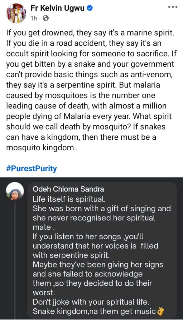 Fr. Ugwu stated this in a Facebook post on Monday, February 2,2026 after a lady attributed Ifunanya Nwangene’s d3ath to ‘serpentine spirit’ and snake kingdom.