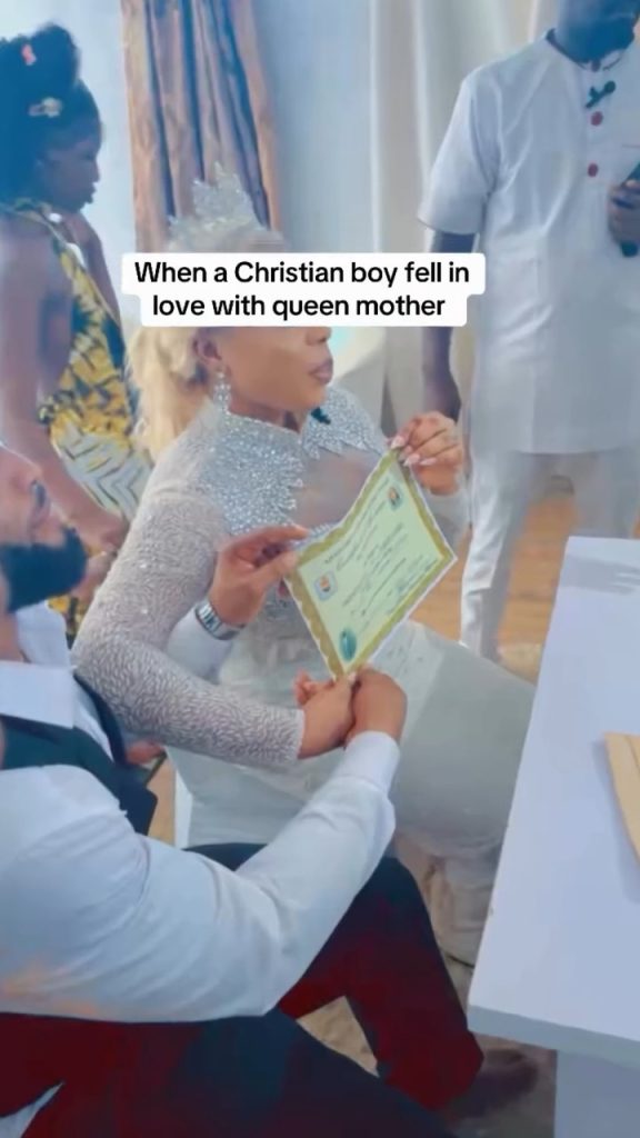 “When a Christian boy fall in love with queen mother,” the bride boasted as she showed her and the groom holding up their marriage certificate.