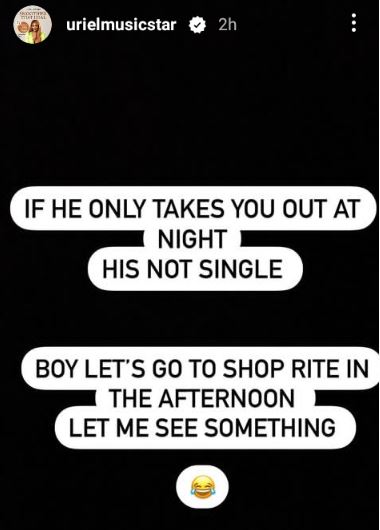 Uriel revealed that any man that only takes a woman out at night is not single.