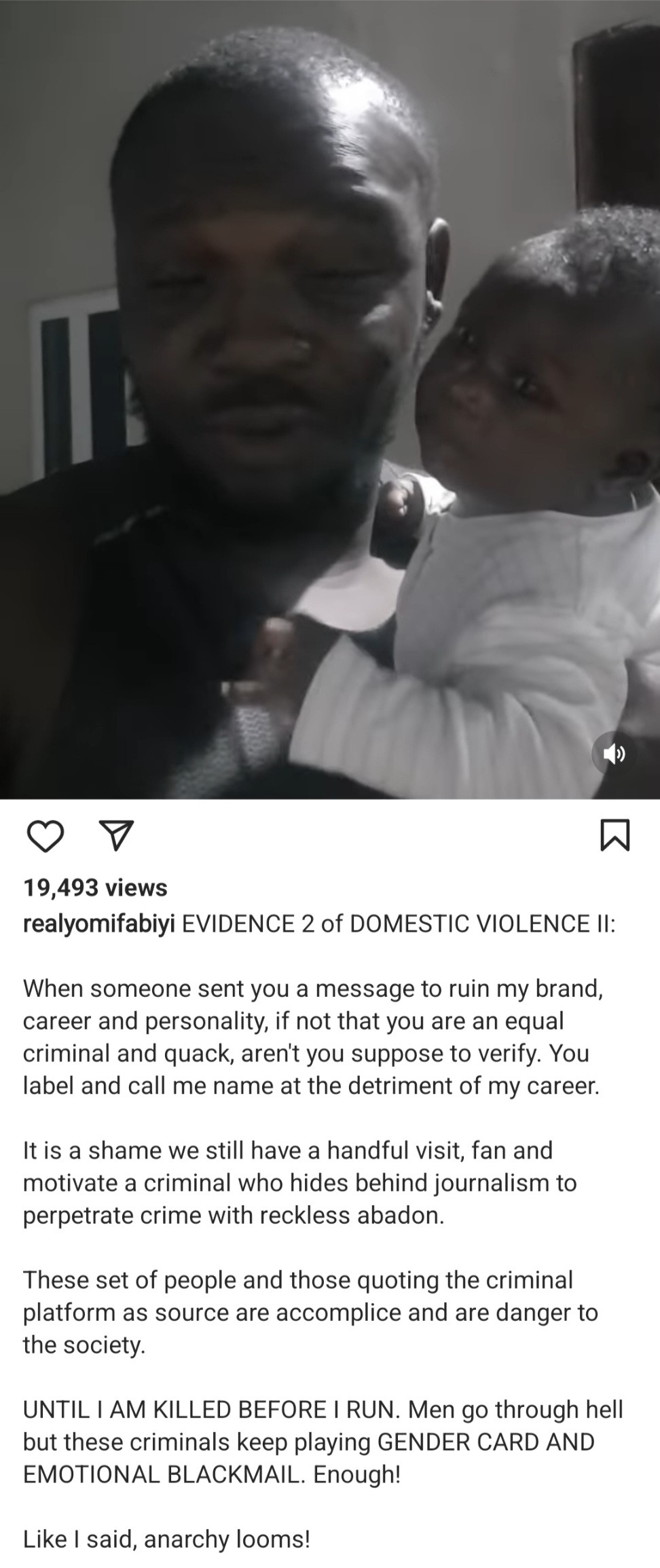 Popular Yoruba actor, Yomi Fabiyi has cried out on Instagram accusing his child’s mother, Amarachi Grace Oreofe of threatening his life.