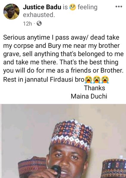 “Serious anytime I pass away/ die, take my corpse and bury me near my brother’s grave, sell anything that’s belonged to me and take me there. That’s the best thing you will do for me as friends or brother. Rest in jannatul Firdausi bro,” he said in a Facebook post on Thursday, May 11, 2023.