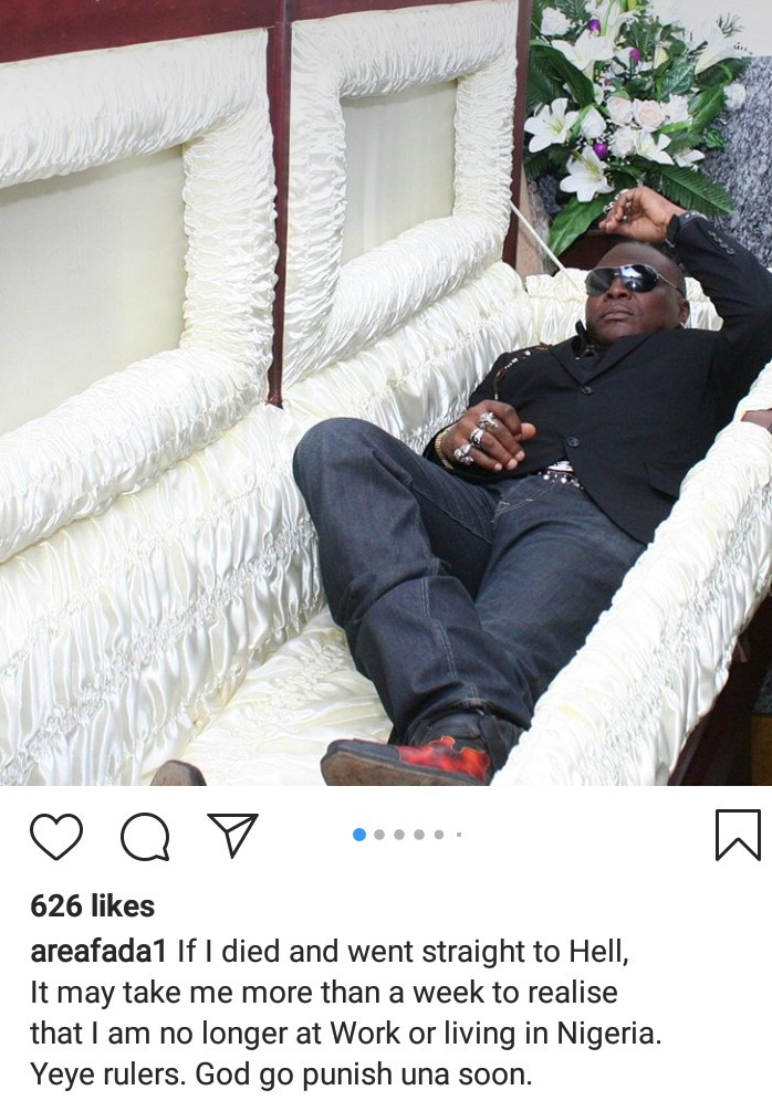 Charles Oputa, better known as Charley Boy or Area Fada, has shared photos of himself in a casket as he likened the condition of Nigeria to being in hell.