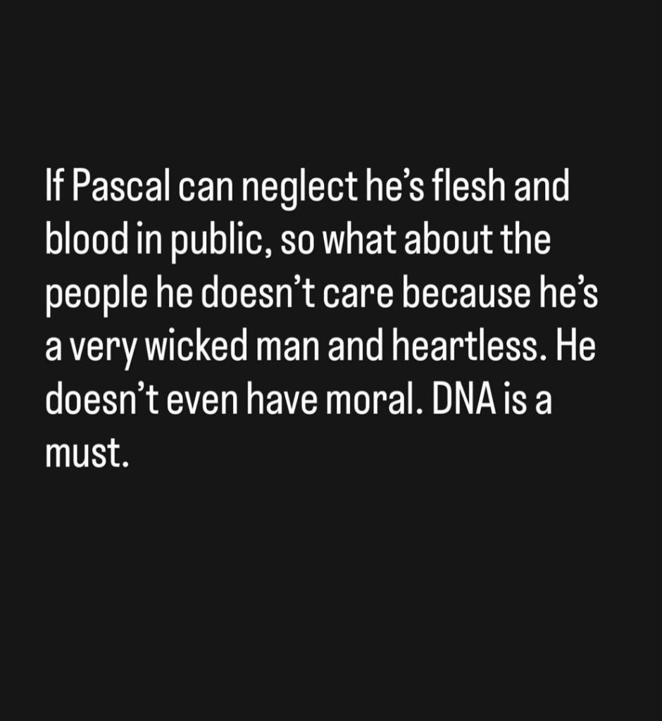 “If Pascal can neglect his flesh and blood in public, what about the people he doesn’t care about? He is a very wicked and heartless man. He doesn’t even have morals. DNA is a must.”