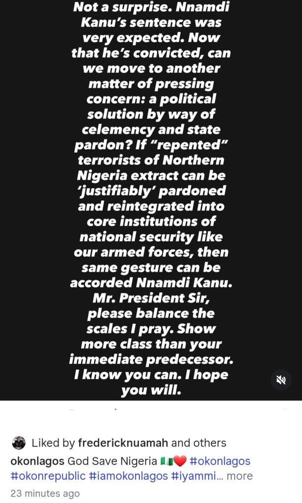 Okon Lagos wrote: “Not a surprise. Nnamdi Kanu’s sentence was very expected. Now that he’s convicted, can we move to another matter of pressing concern: a political solution by way of clemency and state pardon?