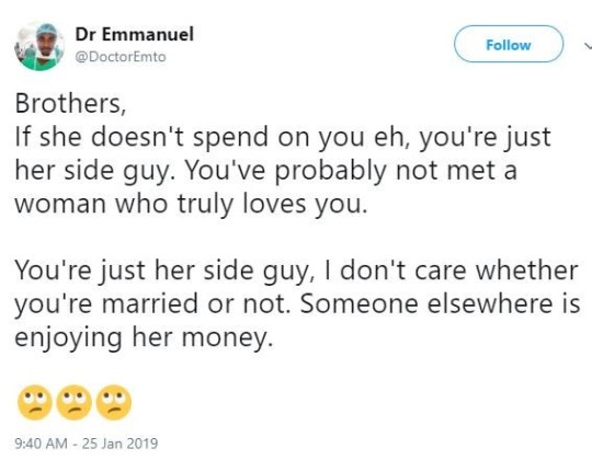 A Twitter user identified as @DoctorEmto is of the opinion that a woman who doesn’t spend on her man is not in love him. According to the young man, if your girlfriend doesn’t spoil you with her money,it is a sign that you are just a side guy.
