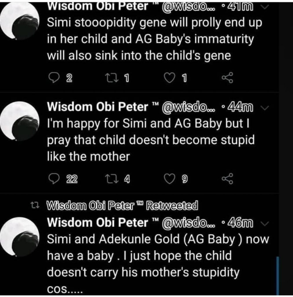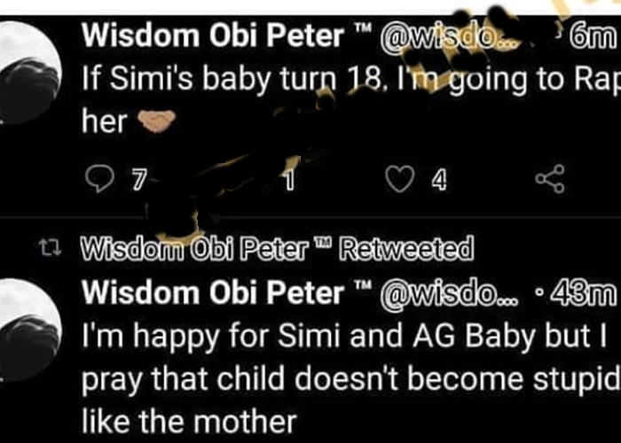 A Nigerian man identified as Wisdom Obi Peter is currently under fire on social media after he bragged that he would r*pe Simi’s new daughter once she turns 18.