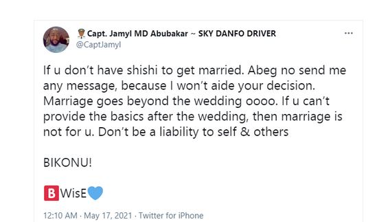 Jamil who is the son of former IG of police, Mohammed Dikko Abubakar, in his tweet, stated those who don’t have money to get married shouldn’t approach him for help.