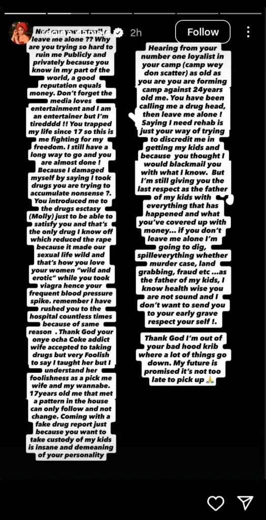 “Ned can you just leave me alone ?? Why are you trying so hard to ruin me Publicly and privately because you know in my part of the world, a good reputation equals money. Don’t forget the media loves entertainment and lam an entertainer but I’m tiredddd !! You trapped my life since 17 so this is me fighting for my freedom. I still have a long way to go and you are almost done ! Because | damaged myself by saying I took drugs you are trying to accumulate nonsense ?. You introduced me to the drugs esctasy (Molly) just to be able to satisfy you and that’s the only drug | know off which reduced the rape because it made our sexual life wild and that’s how you love your women “wild and erotic” while you took viagra hence your frequent blood pressure spike. remember | have rushed you to the hospital countless times because of same reason . Thank God your onye ocha Coke addict wife accepted to taking drugs but very Foolish to say I taught her but | understand her foolishness as a pick me wife and my wannabe. 17years old me that met a pattern in the house can only follow and not change. Coming with a fake drug report just because you want to take custody of my kids is insane and demeaning of your personality