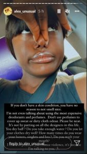 Ex-BBNaija star, Alex has lamented about people having body odour by not taking their personal hygiene seriously.