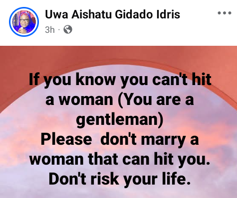 “If you know you can’t hit a woman (You are a gentleman) Please don’t marry a woman that can hit you. Don’t risk your life,” she wrote.