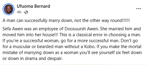 “A man can successfully marry down, not the other way round!!!!!! Sefa Awen was an employee of Doosuursh Awen. She married him and moved him into her house!!! This is a classical error in choosing a man. If you’re a successful woman, go for a more successful man. Don’t go for a muscular or bearded man without a Kobo. If you make the mortal mistake of marrying down as a woman you’ll see yourself six feet down or down in drama and despair,” he wrote in a Facebook post on Wednesday.