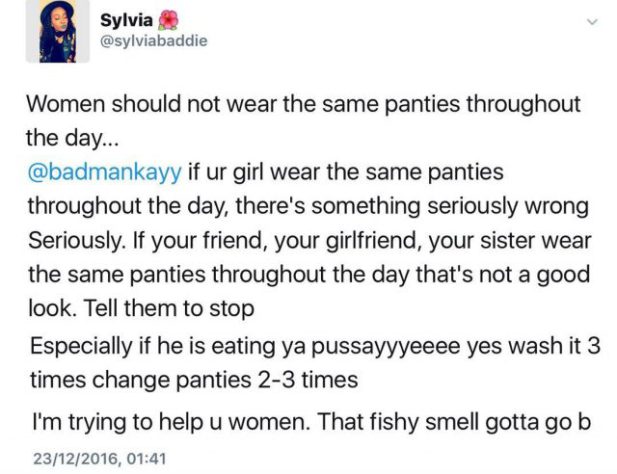 A Nigerian female Twitter User has taken to her page to advise all other ladies who wear a single underwear throughout a whole day.The lady goes by the name Sylvia, and she says Ladies should at least change their underwear 2-3 times everyday.