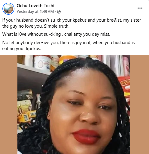 “If your husband doesn’t su_ck your kpekus and your bre@st, my sister the guy no love you. Simple truth. What is l0ve without su-cking , chai anty you dey miss. No let anybody dec£ive you, there is joy in it, when you husband is eating your kpekus,” she wrote.