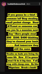 “If you are gonna be a thief/conman Lol. Stop stealing small pocket change. Steal at least so someone can see you in a mansion next day! Here people steal $50, $100, $400 thinking they have cleaned your bank. And tomorrow they still the same,” she wrote.