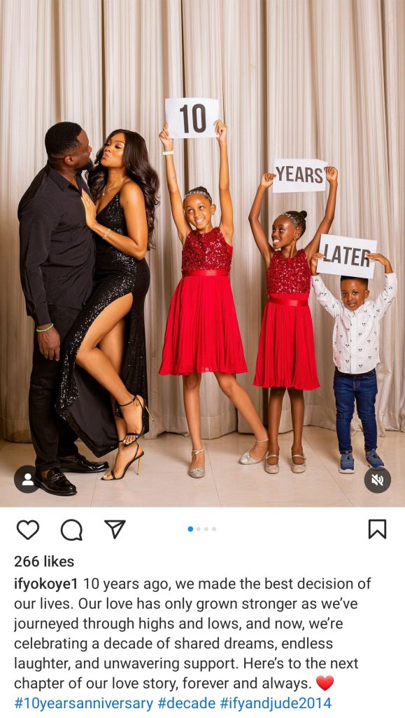 In the caption, Ify wrote: “10 years ago, we made the best decision of our lives. Our love has only grown stronger as we journeyed through highs and lows, and now, we’re celebrating a decade of shared dreams, endless laughter and unwavering support. Here’s to the next chapter of our love story, forever and always.”